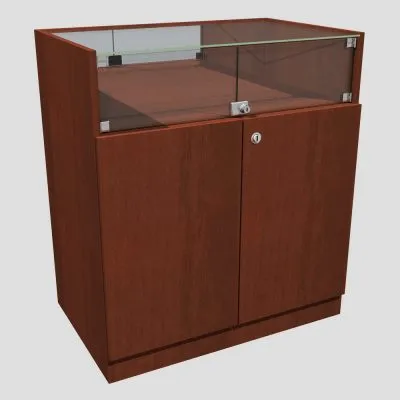 Задняя стенка выставочной части – зеркало, дверцы распашные, в накопителе полкаВитрина-прилавок музейная ПРМ-07