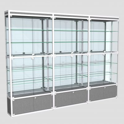 Задняя стенка ДСП, стеклянные полки и раздвижные дверцыЦена по запросуВитрина из профиля тройная ПР-16