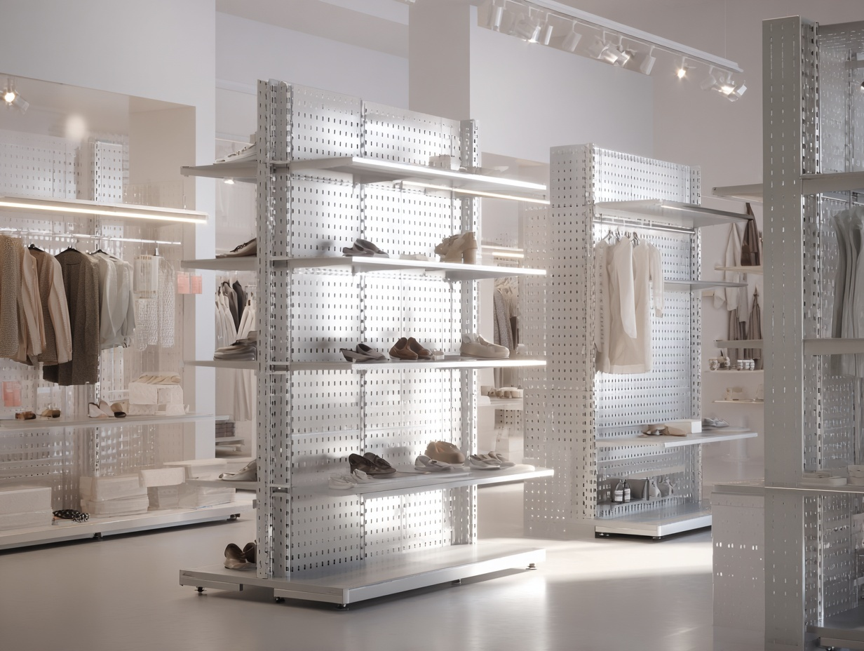 Система основана на перфорированных стойках и большом наборе навесных элементов, что позволяет собирать конструкции под любые задачи магазина.